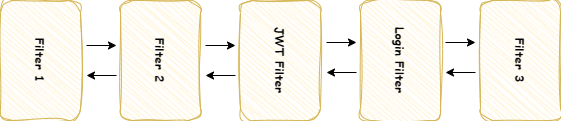 JWT Filter에서 예외가 발생했다고 가정하면 요청은 Filter 1 -> Filter 2 -> JWT Filter(예외 발생) -> Filter 2 -> Filter 1 순서로 응답을 보냅니다
