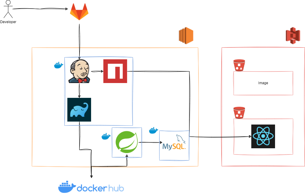 - 백엔드(dev-server)는 Gradle로 build, test 후 Docker 이미지를 생성 후 Dockerhub에 등록