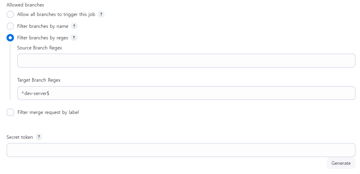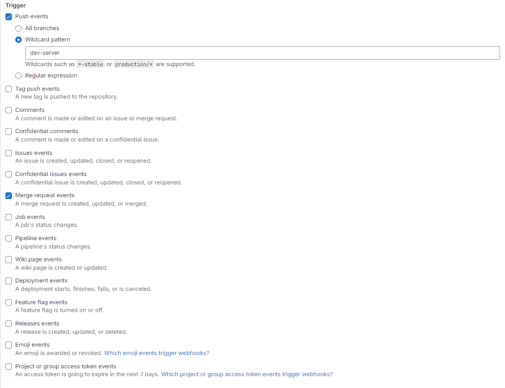 Webhook이 발생할 트리거 선택 : dev-server에 push될 때 mr와 관련된 이벤트 발생