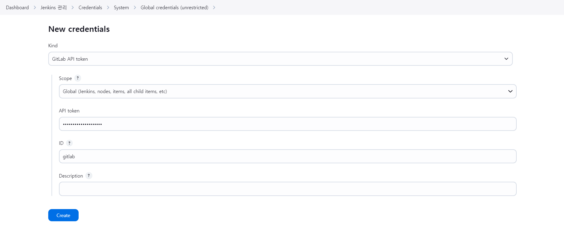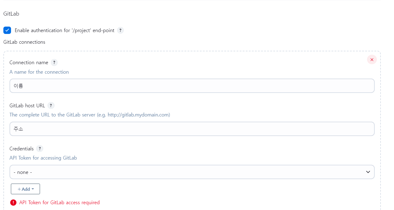 Gitlab에서 생성한 API token 및 ID(Credential의 이름) 입력