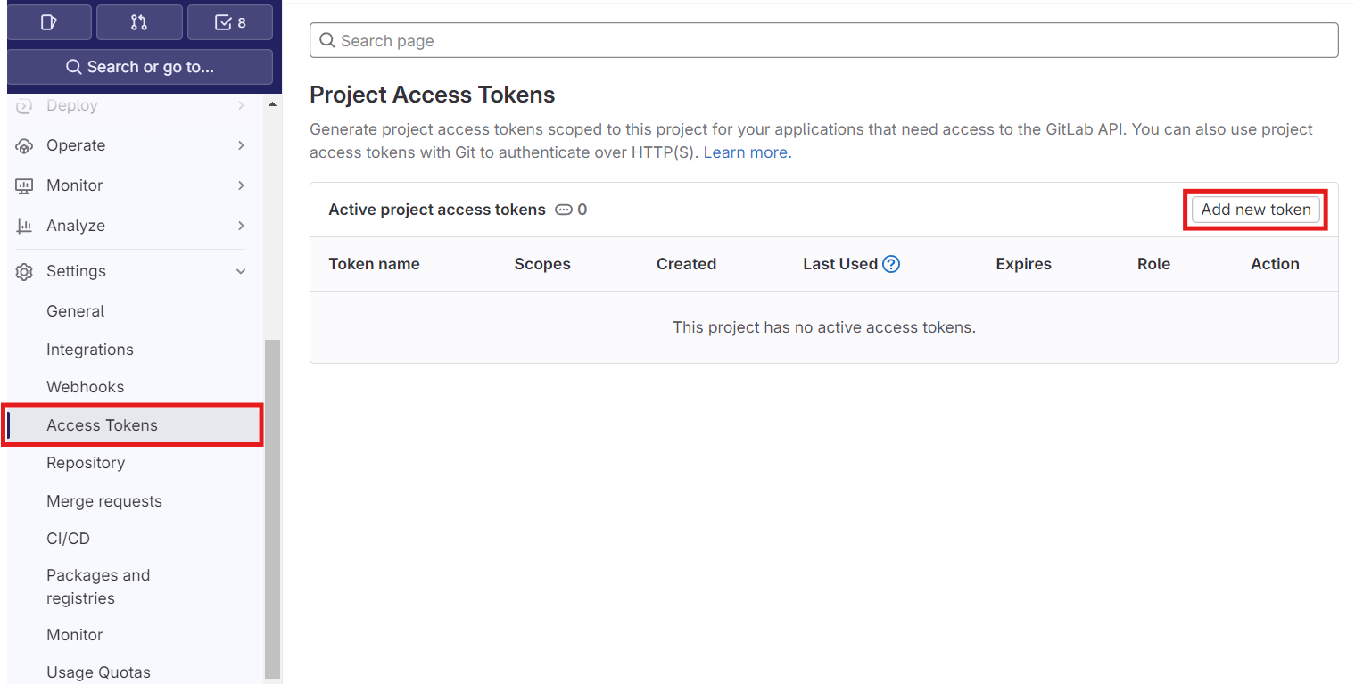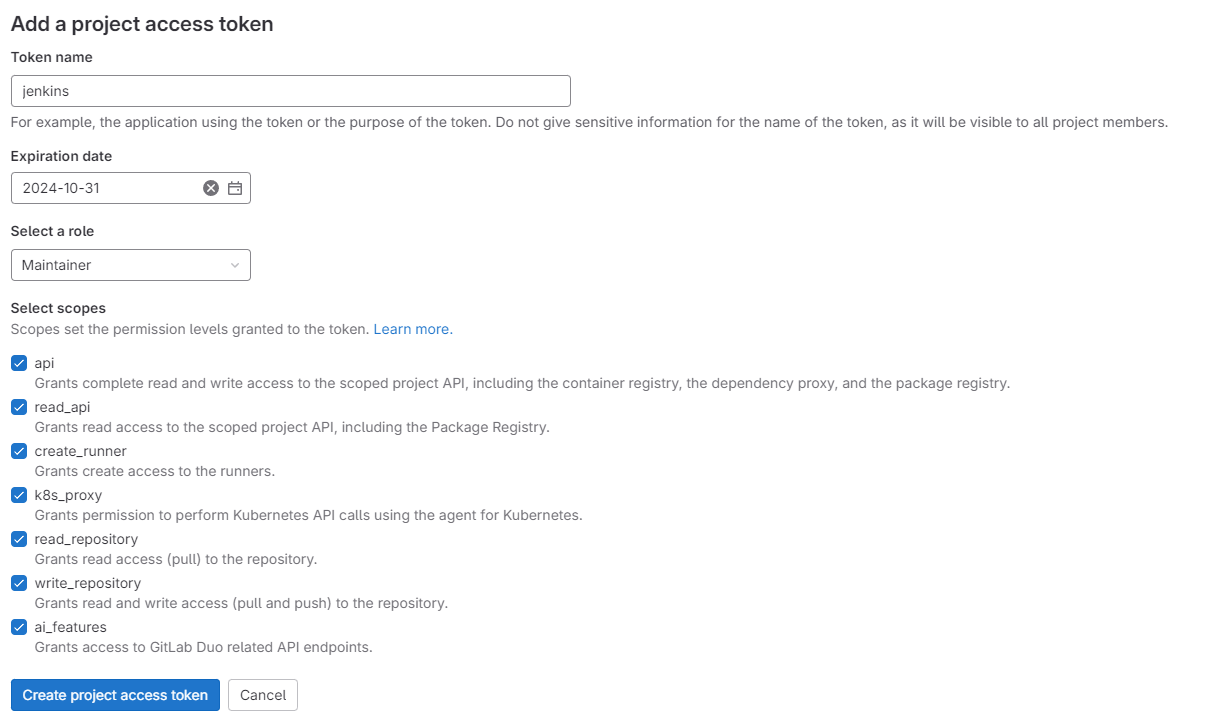토큰 이름, 만료일, 역할, 범위 지정 후 토큰 생성