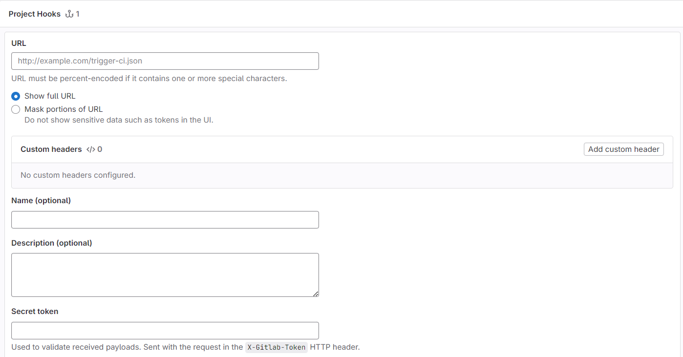 URL과 Secret token에 이전에 기록해 둔 두 값 입력